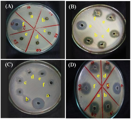 Agar Well diffusion antibiotic sensitivity assay with (a) hydrogel; (b) hydrogel + GO; (c) hydrogel + rGO; (d) aloe vera gel; (e) aloe vera gel + GO; (f) aloe vera gel + rGO against (A) Pseudomonas aeruginosa, (B) Bacillus subtilis, (C) Staphylococcus aureus and (D) E. coli.