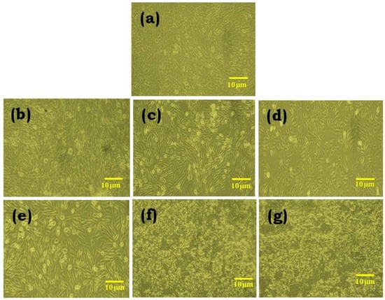 Cytotoxicity Assay of GO and rGO-based composite gels on NIH 3T3 cell line. (a) control; (b) hydrogel; (c) hydrogel + GO; (d) hydrogel + rGO; (e) aloe vera gel; (f) aloe vera gel + GO; (g) aloe vera gel + rGO.