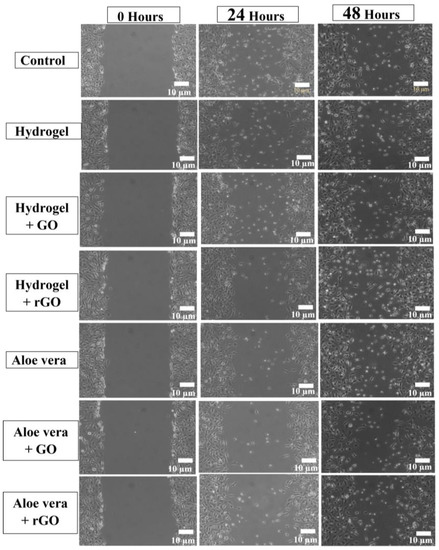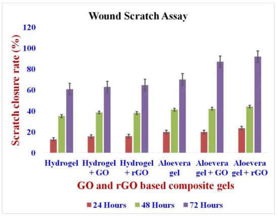 Wound scratch assay of GO and rGO-based composite gels. The study revealed a high level of cell migration, thus revealing significant wound scratch closure.