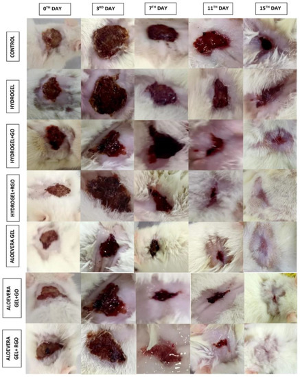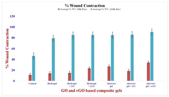 Infections were induced in the open wounds of male Wistar rats by inoculating them with Staphylococcus aureus. The formulations were daily applied over the wound surface for the treatment groups for 14 days (Figure 15). The measurement of wound contraction is a major standard for the indication of radical wound healing [57], which is expressed as the decrement in the wound diameter from the surgery date. All wound contraction was calculated by tracing out the wound surface every 0th, 3rd, 7th, 11th, and 14th days (Figure 16). The wound treated with the composite gels showed a significant decrease in the wound area during the course of treatment. At the end of the treatment period of 14 days, the rGO-based aloe vera gel showed the best wound contraction rate, followed by rGO-based hydrogel formulation. This shows that the rGO best imparts the wound healing property compared to that of GO. Henceforth, its conjugation with hydrogel and aloe vera gel showed almost the same results of wound contraction and hastened the healing property.
