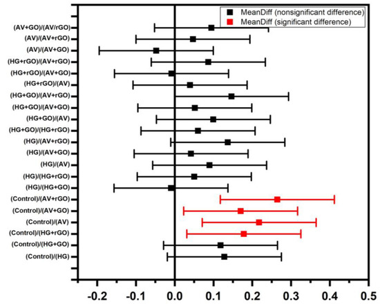 All the reported results were analyzed for their statistical significance, which was studied using one-way ANOVA (p < 0.5 and p < 0.1). There was a significant healing of wounds as a function of time in all groups, and there (Figure 19) was a significant difference between the groups (p < 0.5). From the study, it was evidently proven that wound healing capability was significantly improved in the presence of GO and rGO.