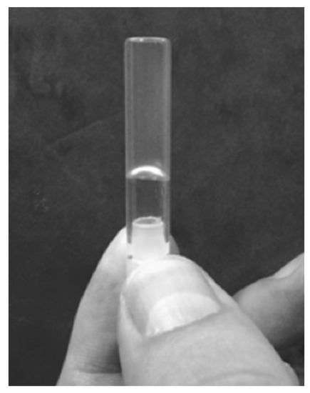 Photograph of the translucent and stable gel of ivory nut nanocellulose obtained from the endosperm of crude parenchyma treated with 8 M H2SO4 for 4 h at 30 °C and ultrasonicated (treatment 4 in Table 1).