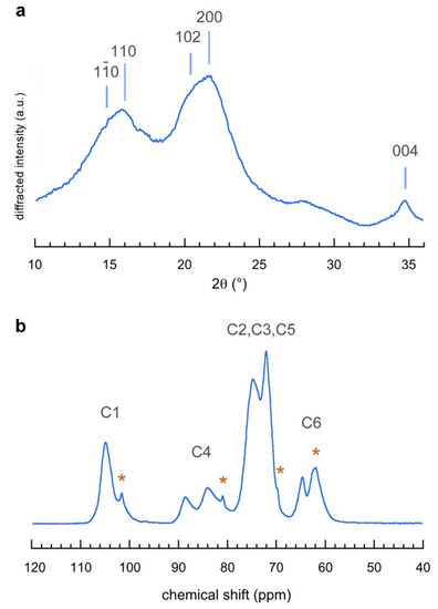 (a) X-ray powder diffraction pattern, and (b) CP/MAS 13C-NMR spectrum of the extracted nanocellulose (ENC). In (a), the Miller indices correspond to those of cellulose Iβ [33]. In (b), the asterisks indicate the presence of a minor fraction of residual mannan I in the ENC sample (Figure S3). * means other significant peaks.