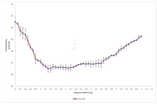 The sulfation degree was calculated from the titration of nanocellulose suspensions extracted at 8 M H2SO4 for 4 h at 30 °C. The strong acid groups titration corresponds to sulfate groups esterified to the primary alcohol groups of cellulose fibers. The results are plotted in Figure 5. Using Equation (1) with Ct = 2000 μMNaOH L−1, VL = 0.0013 L, and w = 0.020075 g, the sulfation degree was calculated to be X = 129.51. The sulfation degree reported in the present work is lower than those previously reported in the literature. For instance, in the case of nanocrystals prepared by H2SO4 hydrolysis of cotton cellulose, the sulfation degree was 171 μM –SO3− g−1 [47]. Other similar sulfation measurements reported in the literature were in the 173 to 214 μM –SO3− g−1 range [48]. Other studies focused on the sulfation of nanocellulose crystals showed values fluctuating between 226.1 to 276.8 μM –SO3− gENC−1 [49]. According to the authors, considering the shape and size of these particular specimens, this sulfation degree means that about 30% of the available primary hydroxyl groups of cellulose nanocrystals are sulfated. If this data was comparable to ENC reported in the present work, it would mean that about one-fourth of the available primary hydroxyl groups of the nanofibrils would be sulfated. This explains the stability and homogeneity of the ENC suspension, as illustrated in Figure 1: the ionization of sulfate groups at the surface of nanofibrils provides negative charges that promote electrostatic repulsion and confer high colloidal stability to the ENC suspension.