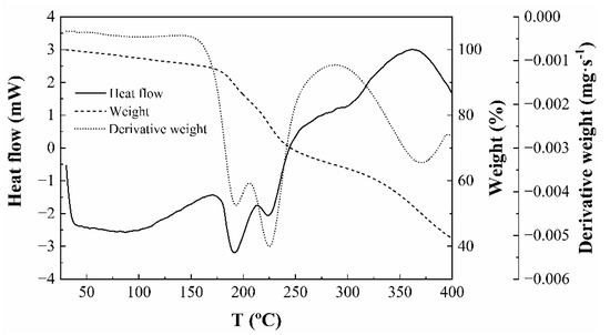 Thermal stability is critical for the application of nanocellulose and thus, a pyrolysis kinetics analysis was conducted to determine the thermal degradation processes of the nanocellulose quantitatively. The thermal properties of the ENC fraction were characterized by thermogravimetric/derivative thermogravimetric (TG/DTG) and differential scanning calorimetry (DSC) analysis. The decomposition pattern of the ‘as obtained’ material is presented in Figure S4. The first thermal effects were a small weight loss at around 88 °C, related to dehydration, followed by another weight loss at 348 °C, between the temperatures reported by Cheng et al. [51] for cellulose nanocrystals prepared by acid hydrolysis (at 365.5 °C) and by Ketabchi et al. [52] for cellulose nanoparticles from kenaf fibers (at 335.2 °C). This degradation step represented the largest weight loss of the polymer and is usually considered a good indicator of the thermal stability of polymer composites [53]. The final decomposition was found to occur in two steps, with maxima at 454 and 720 °C, respectively. These results were similar to those reported for other nanocellulose TG analyses [54]. The thermal curves of cellulose gels and films (Figure 6) showed weight losses at 190 and 225 °C, followed by decomposition at 368 °C. These findings were in agreement with others described in the literature, except for the fact that the two effects below 230 °C appeared as a single effect at 219 °C in the work by Morais et al. [54], which may be explained by differences in heating rates. The reported thermal kinetics of the material should be useful with a view to a better design of polymer composite processing and to estimate the influence of the thermal decomposition of natural fibers on the composite properties.