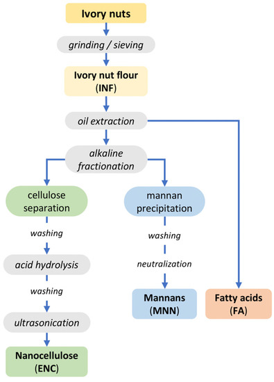 Ivory nut leftovers were obtained from a button factory in Manabí province, Ecuador. The hard and woody endocarp was completely removed by polishing to expose the endosperm. The seeds were cracked with a hammer and small pieces were ground by ball-milling. The ivory nut flour (INF) was screened in a 100-μm mesh sieve and utilized in further fractionation processes, as depicted in Scheme 1. The experimental design and methods utilized in those processes are detailed in the patent application IEPI-2016-61010 [64].