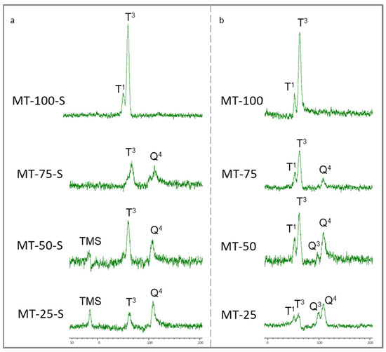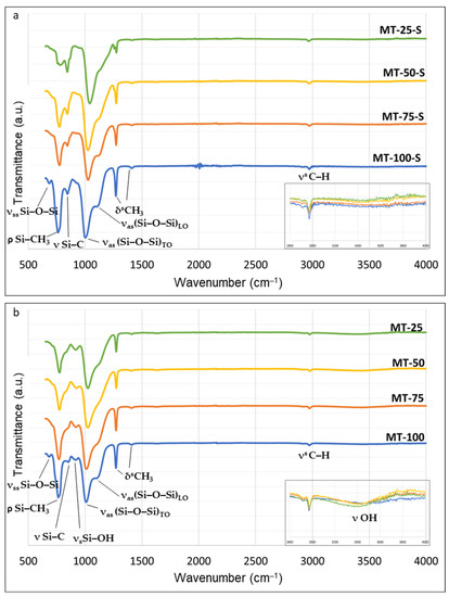 In Figure 1, the intense silicon–oxygen covalent bonds that appeared in the 1000–1150 cm−1 range were related to the asymmetrical stretching vibration of the siloxane bonds confirming a three-dimensional (3-D) silica network. According to the spectra, all samples exhibited a high degree of polycondensation regarding intense Si–O–Si peaks in this range and it was in a good accordance with the NMR data. For the samples synthesized with 100% MTMS (i.e., MT-100 and MT-100-S), the additional peaks observed at 680 cm−1 as shoulders were also related to the symmetrical stretching vibration of Si–O–Si bond in the solid skeleton [38].