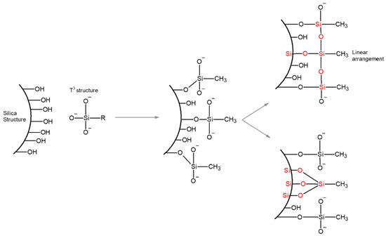 According to the 29Si-MAS-NMR results, the Qn region was entirely dominated by the Q4 (four BOs and zero NBO) groups showing a high degree of polymerization. The siloxane linkage resulting from the TEOS polymerization underwent a different degree of crosslinking and ended up with both Q3 (three BOs and one NBO) and Q4 structures only in samples MT-50 and MT-25. The Q3 structures in these samples showed the presence of the –OH groups in the incompletely condensed silanes. The samples with extra silylation displayed distinct T3 bands only, indicating the high degree of trifunctional silane condensation. The formation of a tridental anchoring of trifunctional silanes by three silanols, which are coexisting on the silica surface and sufficiently close to each other, was very unlikely. These distinct T3 structures were possibly caused by the formation of three Si–O–Si bonds as a result of the condensation between the methoxy groups from two neighboring MTMS [46]. Figure 4 represents a schematic representation of a linearized tridentate anchoring.