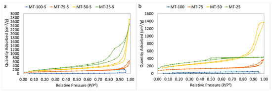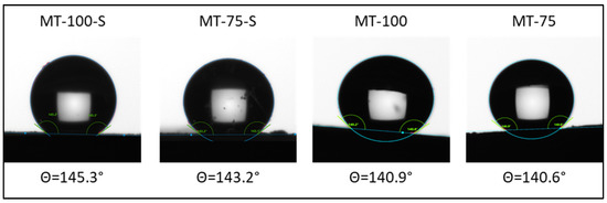The measurements showed that all samples exhibited a hydrophobic behavior with contact angle values greater than 140° due to their high methyl contents. Surprisingly, only slight differences were observed in the obtained contact angles between the samples synthesized with silylation and those that were not silylated. The existence of surface silanols on the non-silylated samples was apparent in the NMR results, but this did not deteriorate the hydrophobicity of the samples to a great extent probably due to their hierarchical porous network. As explained by the Wenzel and Cassie–Baxter roughness-related wettability models, for a hydrophobic surface, the increasing surface roughness can make the material more hydrophobic [54]. The obtained hierarchical meso/macroporous network probably induced the surface roughness of MT-100 and MT-75 and has allowed them to retain their hydrophobic character. Regarding the low-content MTMS samples, although the abundance of in situ-added surface radicals seemed to decrease in the MT-25 and MT-50 (silylated/unsilylated), they still exhibited a hydrophobic character. This finding may confirm the fact that silylation is an effective tool in ensuring the hydrophobic structures regardless of the pre-methylation degree of the wet gels. Although the contact angle measurements could not be performed for the materials having fragmented surfaces (MT-25, MT-25-S, MT-50, and MT-50-S), the hydrophobic character of those samples were visually proven by simply soaking the materials in the water and observing their high water-repelling behavior. A video showing the interaction of the samples with water can be found in the Video S1 in the Supplementary Material.