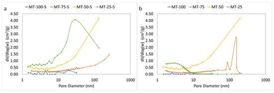 Figure 6 displays the pore size distribution (PSD) curves obtained from the BJH analysis of the adsorption branch of the samples. The isotherm results were reflected well by the BJH outcomes. In the figure, although the pore sizes were mostly located in the mesoporous range in the majority of the samples, the pore distribution still displayed clear variations. At the lowest MTMS content, the pore distribution in the MT-25 tended to shift toward the micropore domain due to the existence of micropores in its structure. Nevertheless, the silylation-applied counterpart of this sample in the other series (MT-25-S) had a broader PSD range. MT-50 and MT-50-S illustrated a wider pore range mostly distributed within the mesoporous range with a small macropore contribution. The PSD of MT-75-S also exhibited a trend similar to MT-50-S. In the non-silylated MT-75, however, a sharp maxima centered above 100 nm was observed confirming the presence of distinct macropores in the network. Although MT-100 and MT-100-S showed some mesopores at certain regions, their proportions were excessively small compared to those of samples with both MTMS and TEOS as the silica precursors and as indicated earlier these samples are mostly comprised of macropores.
