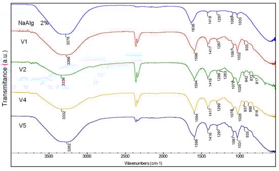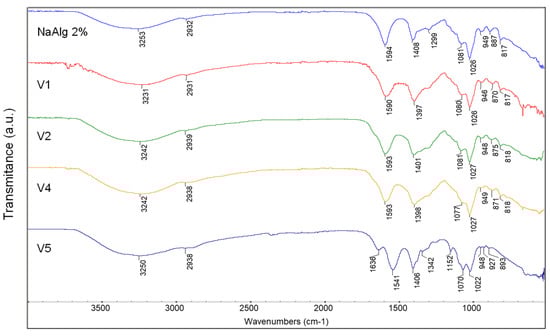 The FT-IR spectra of NaAlg 2%, V1, V2, V4, and V5 amorphous hydrogels.