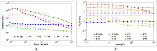 At pH 5, the hydrogels with AV or chitosan (V5) showed an increased viscosity compared with NaAlg, especially as the shear rate was very low or approached zero, suggesting that the gel does not flow at rest [55]. Steady-state flow curves of V1 and V3 gels at pH 5 showed a slight rise in viscosity at low shear rate, possibly because the hydrogels tend to resist the flow due to the strong interactions between hydrogel constituents. Similar behavior has been reported by Irfan et al. when evaluating the flow behavior of xanthan gum, acrylic acid, and N-isopropyl acrylamide [56].
