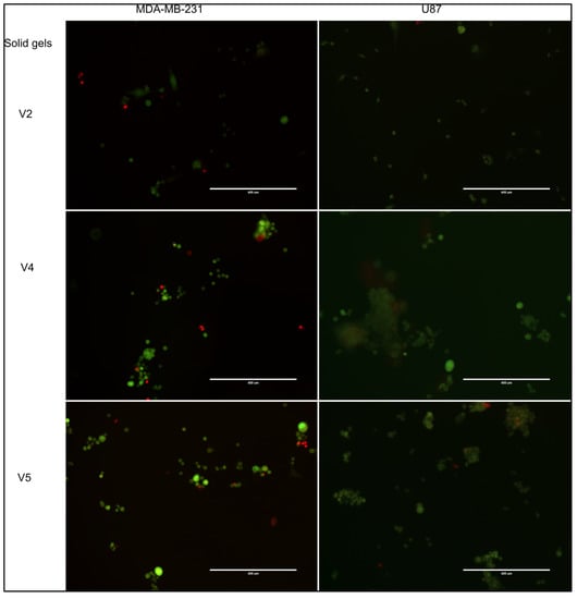 The V4 hydrogel was particularly efficient for U87 spheroid formation, with viable cell aggregates (with green fluorescence) ranging from 100 to 400 µm being observed (Figure 5). V5 hydrogel was also useful for generation of U87 spheroids in the range of 10 to 100 µm. The MDA-MB-231 cell line formed small cell aggregates, in line with its metastatic abilities. V2 hydrogel allowed both cell lines to form small, yet viable, spheroids. In conclusion, these three formulations showed spheroid-forming properties, although the cell type could influence the size and distribution of cells.