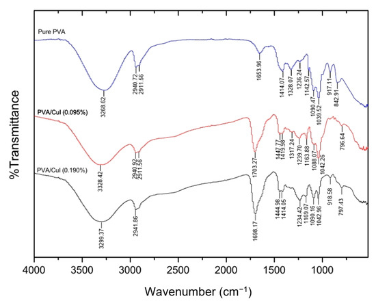 | Pure PVA | PVA/CuI (0.095%) | PVA/CuI (0.190%) | Reference | |
