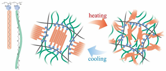 Poly(stearyl acrylate) (poly(SA)) is a thermosensitive polymer. Hydrophobic poly(SA) absorbs lipophilic solvents, but not water, and forms an organogel [14] instead of a hydrogel. Hydrogels consisting of poly(SA) were prepared by copolymerization of SA with a hydrophilic monomer. In the 1990s, Osada et al. [15,16,17] developed poly(SA-co-AA) (AA: acrylic acid) hydrogels that induced a crystalline-to-amorphous transition, which is an order-disorder transition associated with interactions between alkyl side chains at ~40 °C (depending on the monomer composition). This resulted in a significant change in the Young’s modulus and shape-memory function of the material. Furukawa et al. [18,19,20,21] developed poly(SA-co-DMAA) (DMAA: N,N-dimethylacrylamide) hydrogels for applications such as artificial lenses, bandages, and three-/four-dimensional (3D/4D) printing. Additionally, poly(SA-co-AM) (AM: acrylamide) was developed [22]. Thus, poly(SA)-based hydrogels induce a hard-to-soft transition in response to temperature while maintaining a constant volume.
