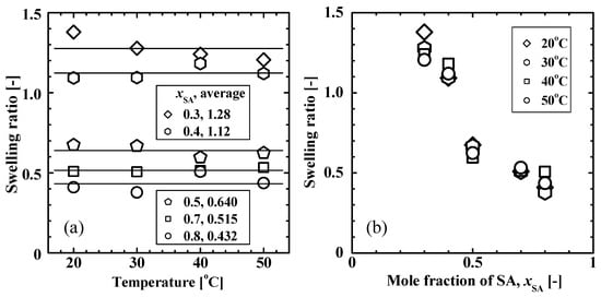 Swelling ratio of poly(SA-co-MPGA) hydrogels at 20–50 °C as a function of (a) temperature and (b) the mole fraction of SA, xSA, in the pre-gel solution. The solid horizontal lines in (a) show the average swelling ratio at 20–50 °C.
