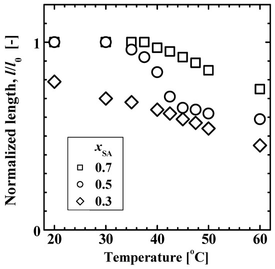 Figure 4 shows the compression test results of the cylindrical poly(SA-co-MPGA) hydrogels using a weight (36 g) as a load under various temperature conditions. The normalized length l/l0 of the hydrogel prepared with xSA = 0.7 was ~1 at 20–37.5 °C, and it decreased with an increase in temperature (>40 °C). This behavior indicates that the hydrogel stiffened <37.5 °C and softened >40 °C. The change in the hardness and softness, that is, the hard-to-soft transition, of the hydrogel was attributed to the crystalline-to-amorphous transition of the stearyl side chains of SA. The crystalline structure of the stearyl side chains function as pseudo-crosslinking points (as shown in Figure 1), enhancing the hydrogel strength. The hydrogel prepared with xSA = 0.5 exhibited a similar thermosensitive behavior; however, the l/l0 value was smaller at temperatures of >40 °C. The hydrogel prepared with xSA = 0.3 had an l/l0 value of ~0.8 at 20 °C, confirming its softness.
