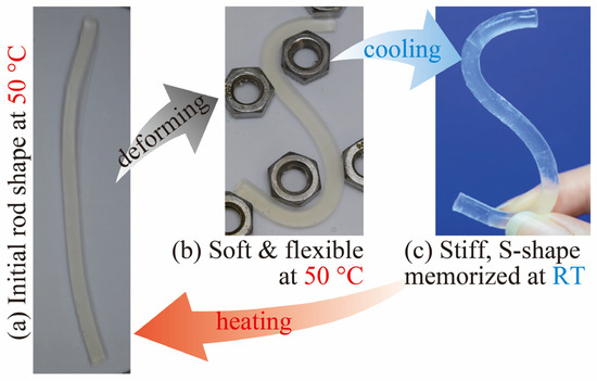 Photographs of the shape-memory function of poly(SA-co-MPGA) hydrogel with xSA = 0.5: (a,b) in water at 50 °C and (c) at room temperature (~20 °C).
