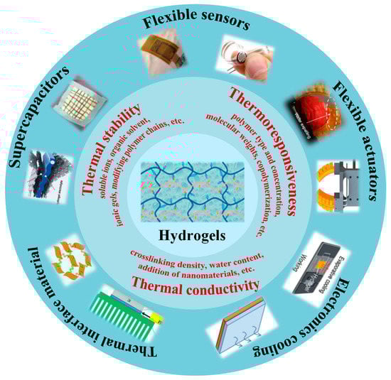 In this review, the thermal properties of hydrogels with the applications in electronic devices are analyzed systematically. The main thermal characteristics with the applications of hydrogels in electronic devices are shown in Figure 1. The research on hydrogel thermal stability, thermoresponsiveness and thermal conductivity from scholars is discussed in detail.