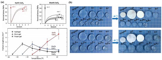 Effects of introducing soluble ions in solvents on the anti-freezing properties of hydrogels: (a) Mechanical properties and fracture toughness of hydrogels with changed CaCl2 concentration under different temperature; (b) Anti-freezing behavior of NH4Cl/betaine or NH4Cl/proline based hydrogels at −40 °C. Reprinted with permission from [17,26].