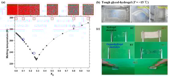 Effects of introducing organic solvents on the anti-freezing properties of hydrogels: (a) Melting temperature of aqueous glycerol changing with glycerol mol fraction; (b) Anti-freezing performance of cryoprotectant filled organohydrogels; (c) Images of hydrogels and organohydrogels electrolytes under low temperature. Reprinted with permission from [31,41,51].