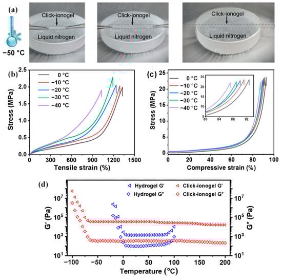 Mechanical properties of click-ionogels at low temperature: (a) Images of click ionogels stretching at approximately −50 °C; (b) Tensile stress-strain curves for click ionogels; (c) Compressive stress-strain curves for click ionogels; (d) Storage moduli (G′) and loss moduli (G″) of hydrogels and click-ionogels. Reprinted with permission from [45].