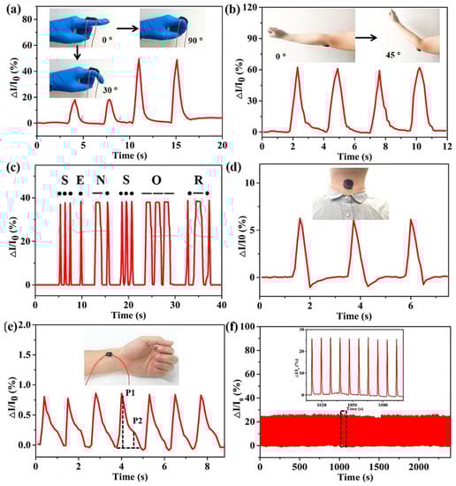 Detection of human motions by wearable organohydrogel-based sensors: (a) Sensor under finger bending with different angles; (b) Sensor under elbow bending with different angles; (c) Sensor by pressing; (d) Sensor under swallowing; (e) Sensor detecting pulse; (f) Durability measurement. Reprinted with permission from [39].