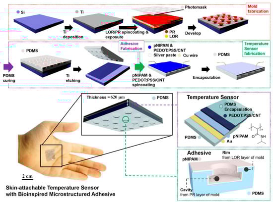 - Oh, J.; Hong, S.; Park, H.; Jin, S.W.; Jeong, Y.R.; Oh, S.Y.; Yun, J.; Lee, H.; Kim, J.W.; Ha, J.S. Fabrication of high-sensitivity skin-attachable temperature sensors with bioinspired microstructured adhesive. ACS Appl. Mater. Interfaces 2018, 10, 7263–7270. [Google Scholar] [CrossRef]