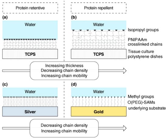 Hydrodynamic diameter variation of crosslinked PAM/PNIPAM due to temperature. (a) Schematic plot of e-beam-grafted insoluble PNIPAM surface; (b) PNIPAM chain density decreases with the increase of graft thickness; (c) Schematic plot of methoxy-terminated oligo self-assembled monolayers on silver; (d) Less compacted self-assembled monolayers forming on gold. Reprinted with permission from [120].