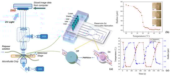 Microfluidic chip integrated with PNIPAM microvalves: (a) Schematic drawing of the PNIPAM microvalve; (b) Radius of PNIPAM microvalve with temperature; (c) Temperature cycling test results of PNIPAM microvalve with temperature. Reprinted with permission from [122].