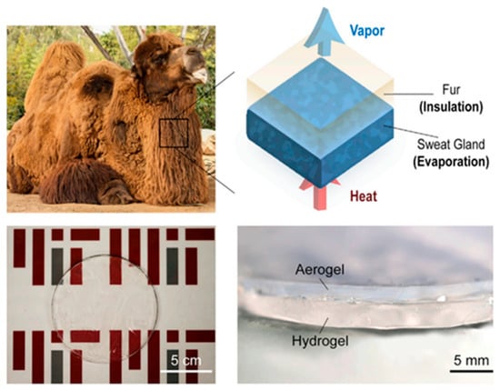Since hydrogels contain a large amount of water, this allows them to have thermal and conductive properties analogous to liquids, while maintaining the dimensional stability of solids, which is ideal for flexible energy storage devices. Zhou et al. [126] developed a thermoresponsive smart window with excellent thermal energy storage performance by dispersing poly (N-isopropylacrylamide) hydrogels particles in water to form water-rich thermoresponsive liquid within glasses. The thermoresponsive hydrogel-based structure acted as an energy storage layer with an additional function to absorb and store energy for smart window. When the temperature was below the LCST, water molecules within the hydrogels enhanced the solar transmission rate of windows to heat the room, while water molecules were released from the hydrogels above LCST, resulting in shrinkage particles causing light scattering. The structure could reduce 44.6% energy consumption compared with the traditional glass due to the hydrogel-derived liquid within the glasses. Yin et al. [127] produced a kind of room-temperature phase change organohydrogel (PCOH) consisting of disodium phosphate dodecahydrate (DPDH) as phase-change hydrated salts and polyacrylamide glycerol hydrogels through a facile photoinitiated one-step in situ polymerization process. Comprising environmentally friendly DPDH hydrated salts PCMs into anti-drying 3D networks of PAM organohydrogels could break through the solid rigidity and melting leakage. The PCOHs demonstrated excellent phase-change temperature control and energy storage capabilities along with outstanding anti-drying, flexibility, form stability and thermal cycle stability. Inspired by the fur layer of desert animals, Lu et al. [128] presented an evaporation-insulation cooling concept based on hydrogels and aerogels, as shown in Figure 11. Aerogels were composed of hydrophobic silica with a porosity of 95% and a thermal conductivity half that of air. The double layer structure relied on water evaporation from hydrogels through highly porous aerogels with ultra-low thermal conductivity and minimized heating from the surrounding, which could prolong the lifetime of cooling package by 400% in contrast to the traditional single layer design. The findings provided design criteria for evaporation-insulation systems.