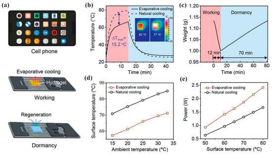 Evaporative cooling capability of Li-PAM hydrogel for mobile phone chip: (a) Cooling principle of Li-PAM based hydrogel; (b) Temperature variations of chips with and without the hydrogel; (c) Weight variation of the hydrogel during the cooling and regeneration processes; (d) Chip temperature variation with ambient temperature during heating; (e) Maximum allowed power for chip with and without the hydrogel. Reprinted with permission from [129].