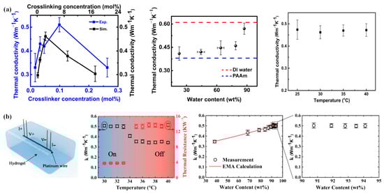Thermal conductivity of hydrogels for electronic devices applications: (a) Thermal conductivity of PAM hydrogels; (b) Thermal conductivity of thermal switch based on PNIPAM hydrogels. Reprinted with permission from [133,137].