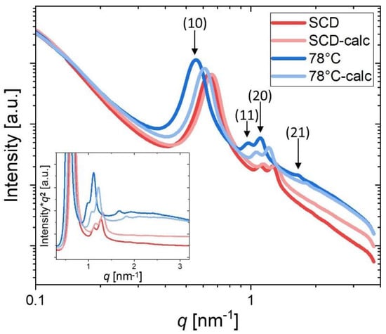 The SAXS patterns provide information mainly on the 2D hex ordered mesopore arrangement. To be able to evaluate the influence of the drying process on the pore structure, scattering profiles of the samples SCD and 78 °C were representatively compared after drying and after calcination (see Figure 4). All four samples show characteristic Bragg peaks related to the 2D hexagonal arrangement of the pores (i.e., the pores are hexagonally arranged and “infinitely” long). The peak position can be related directly to the shrinkage process via the lattice parameter (see Table 1). For both drying procedures, only shrinkage (shift of peaks to the right to higher q values) occurs during calcination, but without noticeable structural changes or loss of the perfection of the ordered structure. In addition, the reduction of the mean pore center distance during calcination is less pronounced for SCD than for the material dried at 78 °C. By means of SAXS, however, information on the lattice parameter can be obtained. The diffuse scattering below the Bragg peaks is related to disordered porosity. It is clearly seen in the inset of Figure 4 that for the sample dried at 78 °C, this diffuse scattering is considerably higher, with a “hump” around q = 2 nm−1. This indicates a considerably larger amount of micropores and small mesopores being present in these samples, in qualitative agreement with the analysis of the adsorption isotherms.