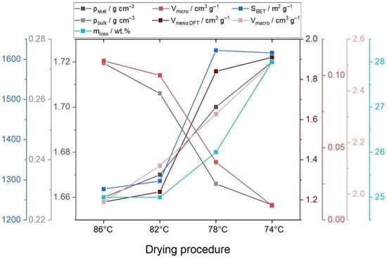 From the N2 physisorption and the SAXS data, it is evident that the mesopore space is significantly affected by the drying method in terms of shrinkage effects. However, these effects extend through the entire pore system as expected, according to the mercury intrusion porosimetry (MIP) results. As listed in Table 1, the macropore volume also considerably changes. Again, the SCD sample exhibits the lowest macropore volume, at 1.72 cm3 g−1, whereas depending on the drying temperature, an increase from 1.97 cm3 g−1 (86 °C) to 2.51 cm3 g−1 (74 °C) for the evaporative drying procedure is observed. Along with this, different macropore diameters (dp,macro) were also recorded, showing only a clear difference between SCD (dp,macro ≈ 400 nm) and evaporative drying. Especially at drying temperatures of 82 °C, 78 °C, and 74 °C, the macropore diameter remains rather constant at around 480 nm. The complete data derived from MIP can be found in the Supplementary Materials section (Table S4). Mercury intrusion curves and pore-size distributions are displayed in Figure S5. Even the changes in the mesopore diameters can be detected with MIP (decreasing the temperature leads to increasing the mesopore diameters—cf Table S4), although this measurement technique can be considered rather unsuitable for the determination of the mesopores in this case, owing to the residual surfactant and its compressibility.