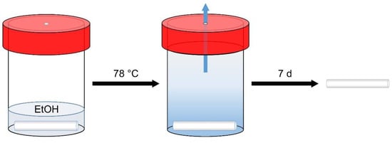 The evaporative drying process under ambient-like conditions was adapted according to the procedure described in Kohns et al., which is illustrated in Figure 6 [58]. The gels were dried at 4 temperatures to study and optimize the process. In detail, the gels were placed in a plastic vessel and submerged in 30 mL of ethanol. The vessel was closed with a prepunched lid to release the exhaust of the evaporated solvent by drying it in an oven at 74 °C, 78 °C, 82 °C, or 86 °C between 3 and 18 days, depending on the temperature (longer drying was performed at lower temperatures). The dried monoliths were sliced in half, with one part calcined at 350 °C for 2 h with a heating rate of 0.5 °C min−1 to remove the incorporated surfactant and obtain highly porous silica monoliths.