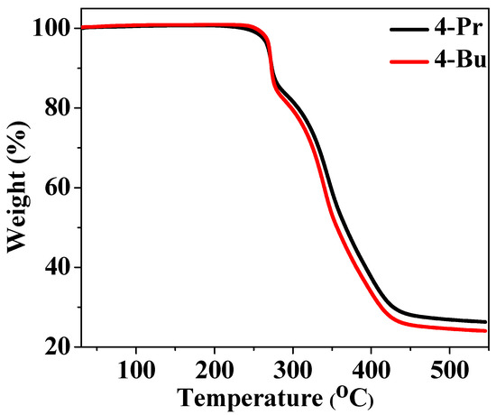 First, the thermal stability of the two mononuclear palladium(II) complexes was observed by thermogravimetric analysis (TG). The TG analysis showed that these materials are stable in the 25–250 °C interval, and their decomposition starts at temperatures higher than 250 °C. Figure 1 displays the TG curves for palladium(II) complexes. The TG curves do not show variations or mass loss in the 25–250 °C region, suggesting that the complexes do not contain small molecules (water or other solvents). The two palladium(II) complexes show decomposition in a single step up to 550 °C (26% residue for 4-Pr and 24% for 4-Bu, respectively).