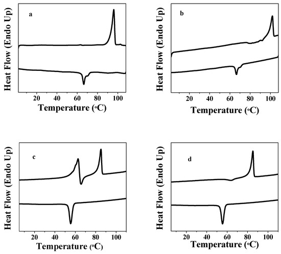 First and second DSC heating–cooling cycles for compound 4-Pr (a,b) and 4-Bu (c,d).