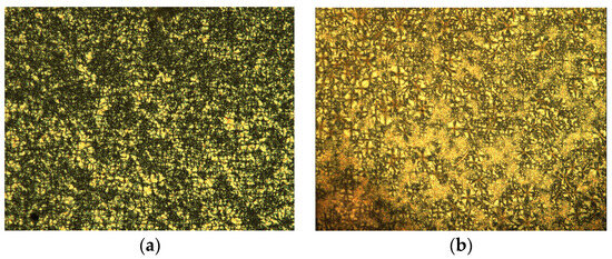 Pictures taken on cooling at the polarizing optical microscope show the optical textures of 4-Pr at 69 °C (a) and 65 °C (b).