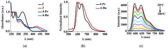 (a) The UV–VIS spectra of compounds 2–4 recorded in dichloromethane solution (conc. 10−5 M); (b) The normalized solid-state emission spectra of palladium(II) complexes (λexc = 365 nm); (c) Temperature-dependent emission spectra for 4-Pr complex during heating from 20 °C to 100 °C.