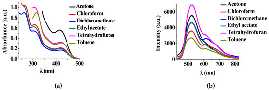 (a) The UV–VIS spectra of compound 4-Pr recorded in different solvents; (b) The emission spectra of 4-Pr in different solvents.
