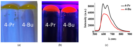 The solid-state emission of the two palladium(II) complexes (Figure 4b) shows two maxima around 590–610 and 640–650 nm, with a shoulder around 707 nm when the sample was irradiated at 365 nm. A slight change in the position of the maxima was observed on changing the carbon chain length (593 nm for 4-Pr and 612 nm for 4-Bu). The intensity of the yellow-orange emission varied amongst the two palladium complexes, which could be correlated with their lateral alkyl groups of the BTU ligands. A weaker intensity emission was observed for 4-Bu, which could account for its higher structure flexibility due to the presence of longer butyl groups. When heating the sample to reach the liquid crystalline state, the emission intensity decreased rapidly (Figure 4b) because of both the influence of temperature and self-assembly in the liquid crystalline phase. The emission could be restored slowly, cooling the samples back to room temperature with a concomitant crystallization process.