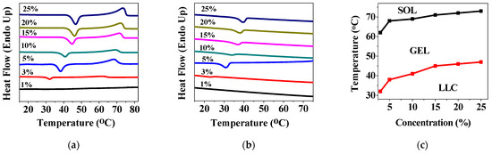 DSC trace of compound 4-Pr at different concentrations during heating (a) and cooling (b). Phase diagram for 4-Pr based on DSC data (c).