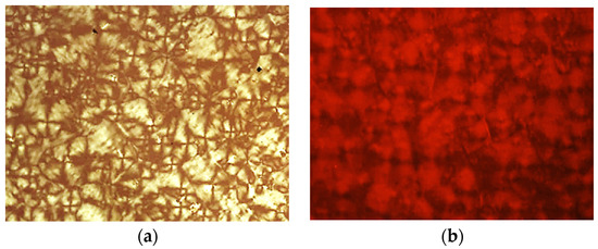 The lyotropic liquid crystal phase of compound 4-Pr (5% gel) in normal polarized light (a) and by irradiation with UV light (b).