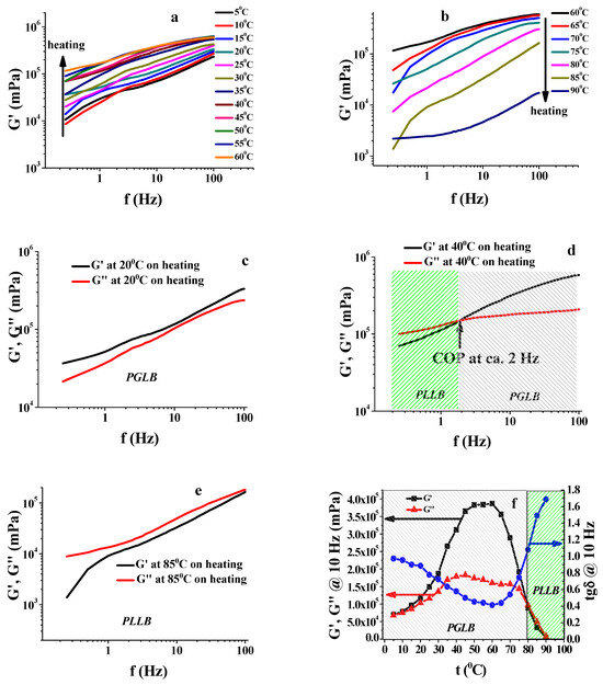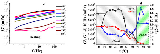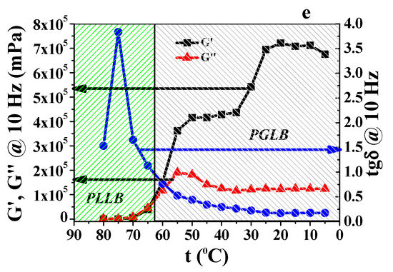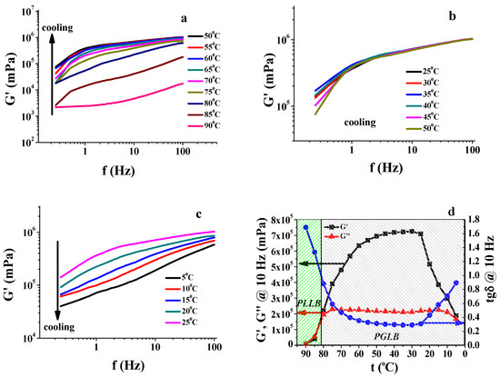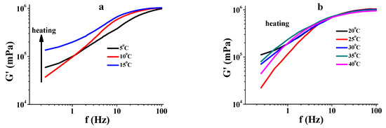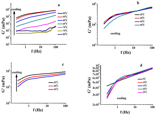 - from 25 °C to 5 °C, G′-f dependences displaced their positions to lower and lower G′ values in the same frequency range (Figure 12c).