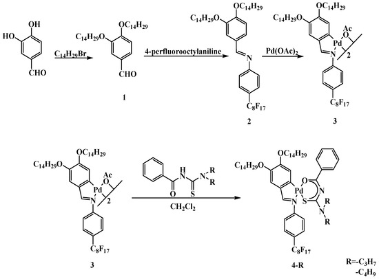 The synthesis pathway presented in Scheme 1 is based on the preparation of related palladium(II) complexes we reported earlier [16,17]. The reaction between 3,4-dihidroxybenzaldehide and bromotetradecane is the initial step in the synthesis, followed by the reaction with 4-perfluorooctylaniline to prepare the Schiff base 2. This product was then employed in a cyclometalation reaction with palladium acetate to produce a high dinuclear palladium(II) complex 3 yield. In the final step, the dinuclear complex was employed to make the mononuclear palladium(II) complexes 4-R by treating them with the appropriate benzoylthiourea derivatives.