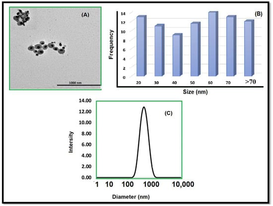 (A) TEM characterization of AgNPs, (B) size distribution as measured by TEM analysis and calculated with 100 nanoparticles, and (C) DLS data of AgNPs with size distribution.