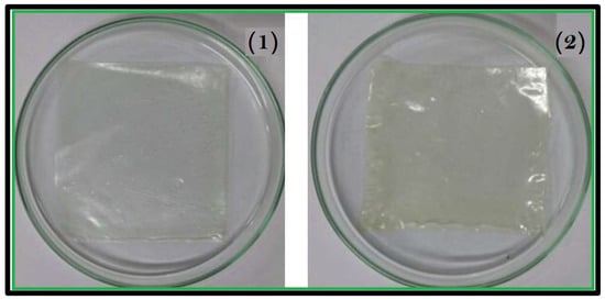 The measured thickness of the prepared hydrogel was illustrated in Table 1. The control sample (1) has the minimum thickness (0.079 mm) while AgNPs hydrogel Sample (2) has a higher thickness (0.14 mm). The presence of AgNPs in the hydrogel film caused an significant increase in thickness. This result matches the results presented in []. Thickness also affects other parameters, such as mechanical and barrier properties, as well as the transparency and visual appearance of the films. In order to acquire the best qualities for their intended use, biopolymer-based edible film thickness is a crucial component that needs to be carefully regulated throughout the manufacturing of the films. Figure 2 shows a visual assessment of both samples.