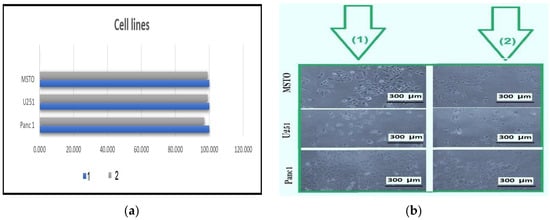 Cytocompatibility test results. (a) Bar graph showing the cell viability (%) after 24 h exposure to control hydrogel (1) and AgNP-loaded hydrogel (2). (b) Hydrogel-free (1) and the test (2) AgNPs encapsulated within Alg–AG using MSTO, U251, and Panc1 cell lines.