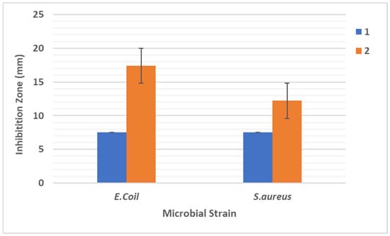 The antimicrobial properties of silver nanoparticles have been extensively investigated. AgNPs have the capability to enhance the permeability of the cell membrane, disrupt DNA replication, denature bacterial proteins, and release silver ions within the bacterial cell. In the current study, hydrogels containing Sodium Alginate–Gum loaded with colloidal silver nanoparticles (AgNPs) were subjected to testing against S. aureus and E. coli using the disc diffusion assay after 24 h. The free hydrogel (1) did not exhibit any antimicrobial activity. In contrast, hydrogel loaded with AgNPs (2) exhibited substantial antimicrobial activity (with a statistical significance of p < 0.001) against both tested microbial strains, as shown in Figure 5. These findings validate the extensive range of antimicrobial effects exhibited by an Alg–AG film infused with AgNPs. Furthermore, the enhanced antimicrobial potency of an AgNP-impregnated Alg–AG film is evident (as shown in Figure 5) in its ability to combat E. coli more effectively than S. aureus (with a significance level of p < 0.001). This variance in antimicrobial performance can be attributed to the variations in the cellular structures of Gram-positive and Gram-negative bacteria. The capabilities of AgNPs to induce a separation between the cytoplasm and the bacterial cell wall has been documented as a mechanism resulting in the death of E. coli Conversely, in the case of S. aureus, AgNPs exhibit an alternative mode of action by impeding the synthesis of the bacterial cell wall, ultimately leading to bacterial cell death [].